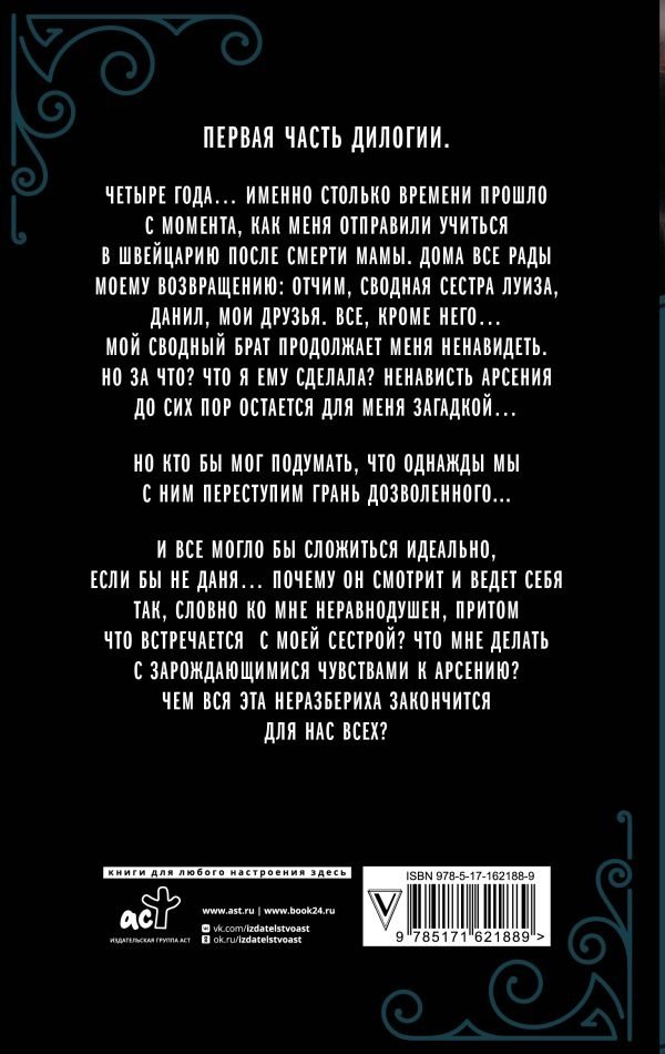 Четыре года… Именно столько времени прошло с момента, как меня отправили учиться в Швейцарию после смерти мамы. Дома все рады моему возвращению: отчим, сводная сестра Луиза, Данил, мои друзья. Все, кроме него… Мой сводный брат продолжает меня ненавидеть. Но за что? Что я ему сделала? Ненависть Арсения до сих пор остается для меня загадкой…