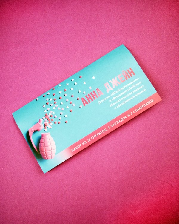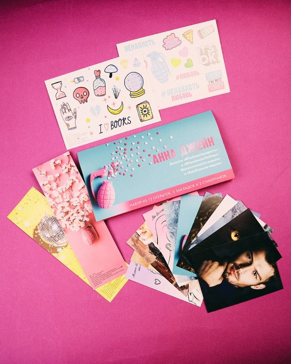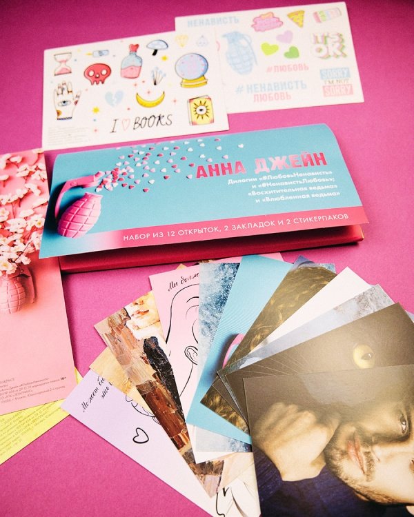 Лучшее дополнение к хорошей книге — это набор с тематическим мерчом по ней! В конверте красочные открытки, закладки и стикерпаки. Мерч вдохновлен оформлением и героями книг Анны Джейн: дилогии «Восхитительная ведьма» и «Влюбленная ведьма», дилогии «#ЛюбовьНенависть» и «#НенавистьЛюбовь».