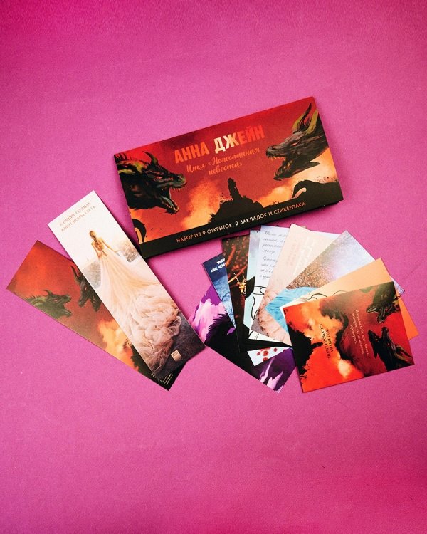 Лучшее дополнение к хорошей книге — это набор с тематическим мерчом по ней! В конверте красочные открытки, закладки и стикерпак. Мерч вдохновлен оформлением и героями цикла книг Анны Джейн «Нежеланная невеста».