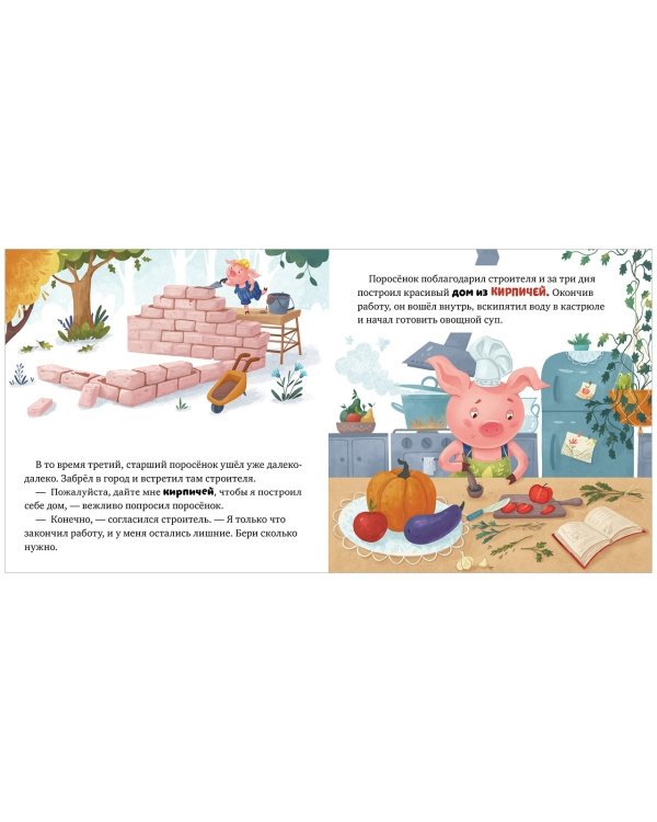 Однажды три поросёнка отправились в лес, чтобы построить собственные домики. Вскоре за ними погнался большой злой волк! Смогут ли поросята перехитрить его? Игры и задания в конце книги!