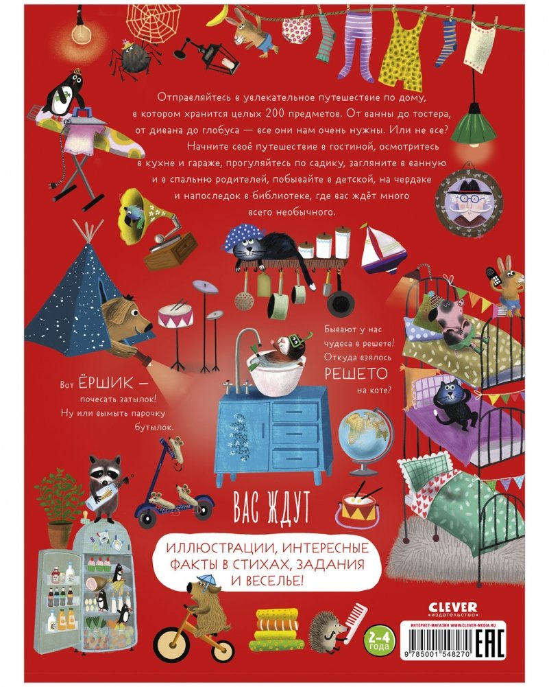 Отправляйтесь в увлекательное путешествие по дому, в котором хранится целых 200 предметов. От ванны до тостера, от дивана до глобуса - все они нам очень нужны. Или не все? Начните своё путешествие в гостиной, осмотритесь в кухне и гараже, прогуляйтесь по садику, загляните в ванную и в спальню родителей, побывайте в детской, на чердаке и напоследок в библиотеке, где вас ждёт много всего необычного. Вот ЁРШИК - почесать затылок! Ну или вымыть парочку бутылок. Бывают у нас чудеса в решете! Откуда взялось РЕШЕТО - на коте? Вас ждут иллюстрации, интересные факты в стихах, задания и веселье!