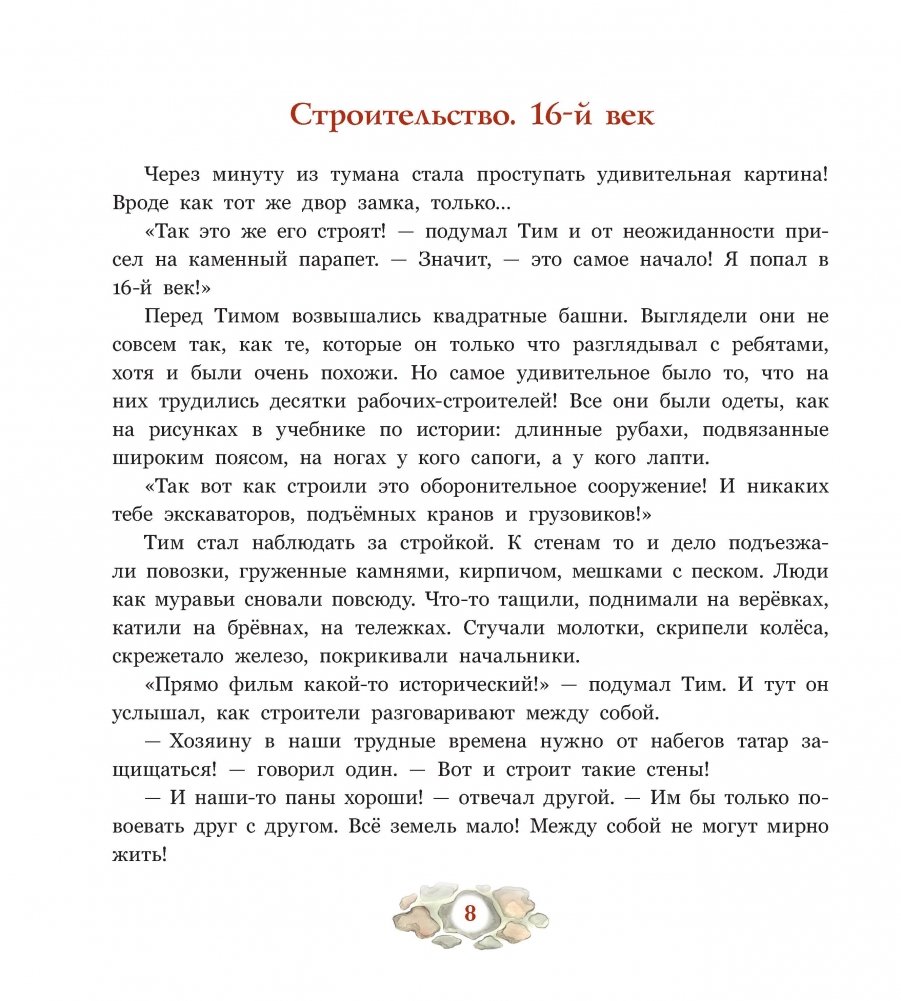 Эта книга — продолжение путешествий Тима и его друзей во времени. Вместе с героями книги вы отправитесь в Мирский замок, окажетесь в далёком прошлом и увидите, как строился замок, как жили его обитатели в разные века. Вы станете участниками опасных приключений в годы войн и нападений на замок, а также проверите, есть ли в замке призраки, о которых узнаете из легенд.