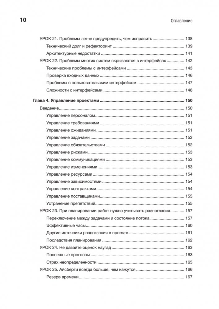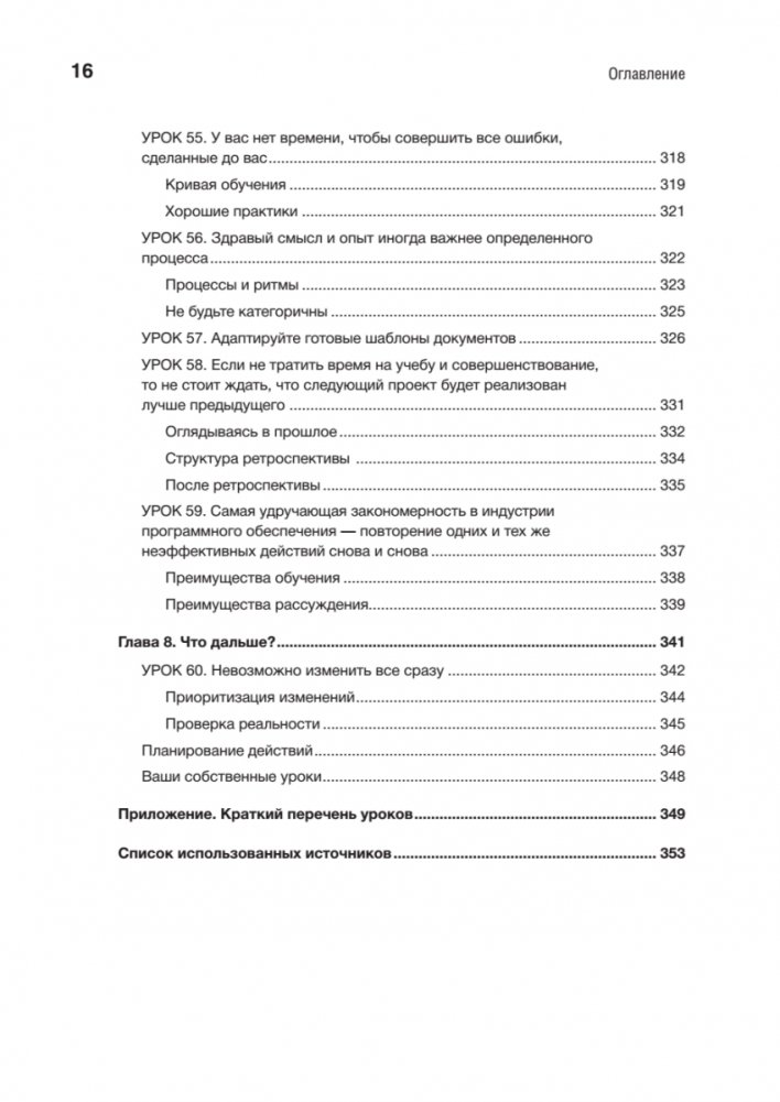 Идеи и конкретные рекомендации охватывают шесть важнейших элементов успеха: требования, дизайн, управление проектами, культуру и командную работу, качество и совершенствование процессов. Для каждого из направлений Вигерс предлагает «первые шаги», позволяющие осмыслить собственный опыт, уроки с основными идеями, реальными примерами и действенными решениями и «следующие шаги» для внедрения опыта в вашем проекте, команде или организации. Эти знания нельзя получить в университете!