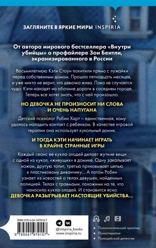 Каждый сеанс ее кукла-злодей делает жуткие вещи с одной из кукол, «живущих» в домике. Одну закалывает ножом, другую топит, третью приковывает цепью к пластиковому диванчику… А потом Робин узнает из новостей о телах девушек, найденных полицией. Телах с травмами, похожими на те, что наносила кукла-злодей. И становится ясно:
