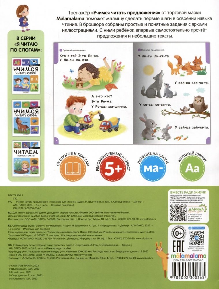 Тренажёр "Учимся читать предложения" от торговой марки Malamalama поможет малышу сделать первые шаги в освоении навыка чтения. В брошюре собраны простые и понятные задания с яркими иллюстрациями. С ними ребёнок впервые самостоятельно прочтёт предложения и небольшие тексты.