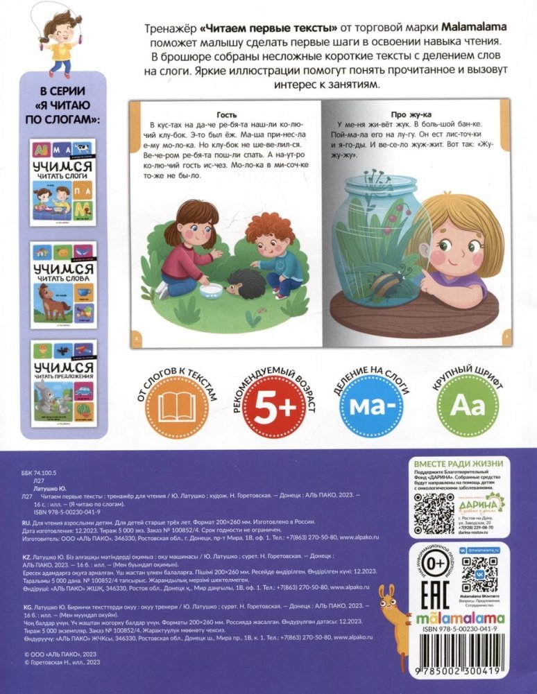 Простая и лёгкая подготовка к школе вместе с серией «Я читаю по слогам» от торговой марки Malamalama. Книги серии помогут любознательному малышу научиться читать от слогов к словам, а от слов к предложениям. Книга «Читаем первые тексты» — это первый тренажёр для ребёнка по чтению целых предложений. Учиться и узнавать новое может быть весело, если делать это вместе с Malamalama!