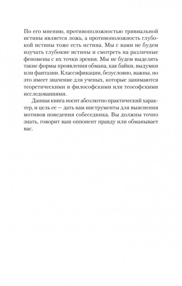 Эта книга — одна из попыток сделать все возможное, чтобы лжи и обмана в нашей жизни стало меньше, а значит, кто-то стал счастливее. Перед вами практическое пособие по безынструментальной детекции лжи. В нем приведены не только советы, но и задания для самостоятельной отработки навыков. Когда уважаемый читатель выполнит хотя бы часть предложенных заданий и упражнений, ложь станет для него достаточно очевидной. Несмотря на то, что текст изложен очень доступно, в его основу положены многотысячные исследования, реальные полевые эксперименты и выборка, которой может позавидовать любой социальный психолог или психотерапевт, а главное — она абсолютно научна.
