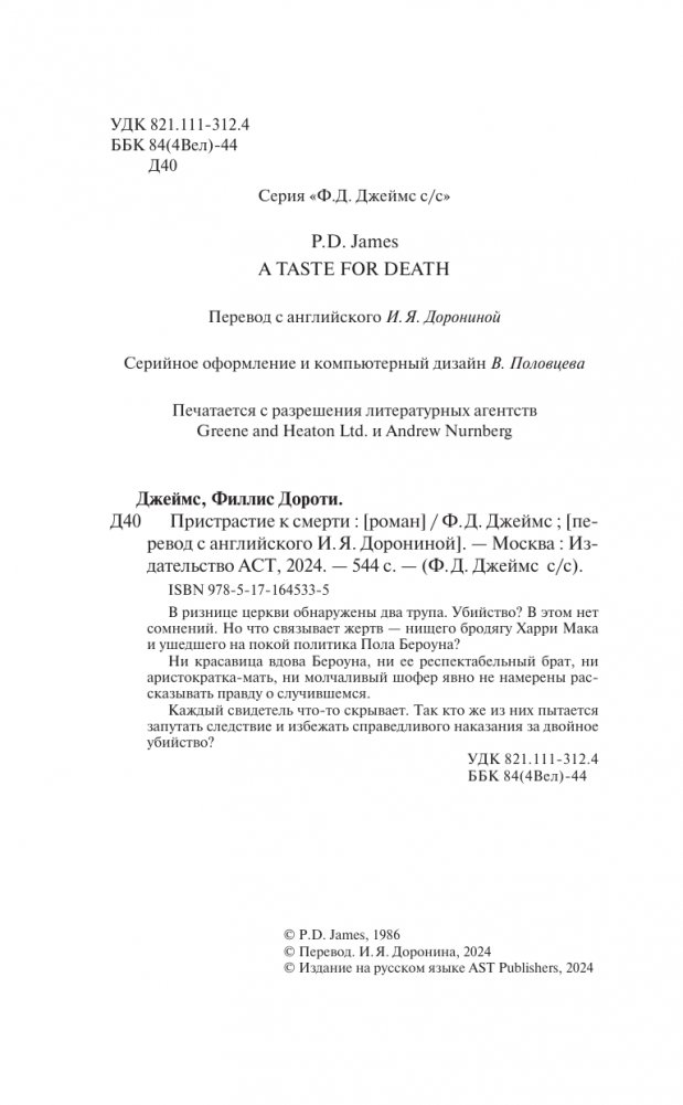 Филлис Дороти Джеймс – королева английского детектива, обладатель множества литературных премий, писательница, которую называют наследницей Агаты Кристи. Все ее романы экранизированы и переведены на множество языков общим тиражом свыше 60 миллионов экземпляров.