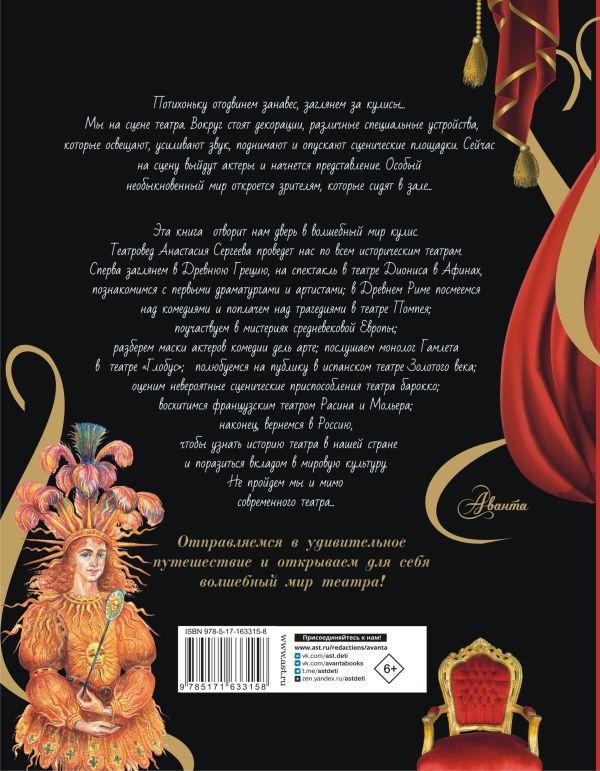 Юные любители театра познакомятся с историей этого вида искусства, пройдя вместе с театроведом Анастасией Сергеевой путь от Древней Греции и Древнего Рима через Средневековье, шекспировский английский театр эпохи Возрождения, театры Испании и Франции и, не пропустив, конечно, знаменитый русский театр, до наших дней. Ребята узнают не только о знаменитых драматургах и актерах, но и об устройстве сцены в разные времена, декорациях и реквизите, специальных театральных машинах, создающих потрясающие эффекты. Это яркое путешествие украсят самые разнообразные иллюстрации, среди которых и картины художника Аллы Ипатовой, представляющие подробное устройство театров разных исторических эпох.