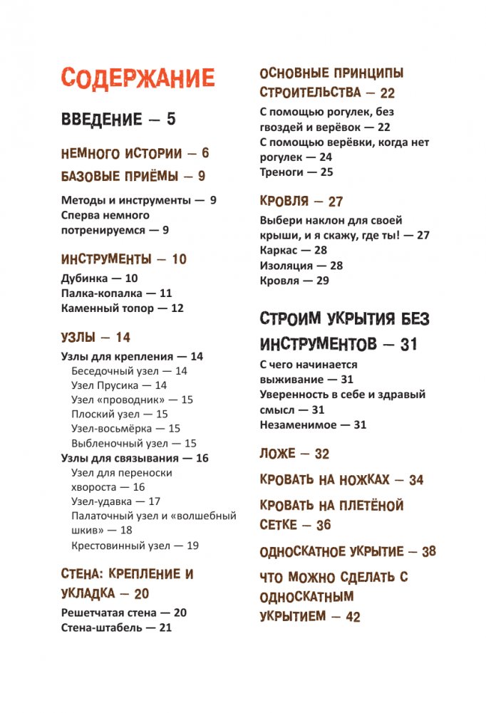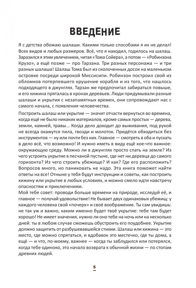 Автор книги – Максим Бертон, опытный искатель приключений и профессионал в области выживания. Он подготовил для вас 22 инструкции, которые помогут построить самые разные укрытия: от квинжи (чтобы спрятаться от снегопада) и хижины Робинзона (защитит от палящего солнца) до настоящего домика на дереве. В книге вы найдёте основные техники строительства и узнаете, какие материалы и инструменты вам понадобятся для вашего убежища.
