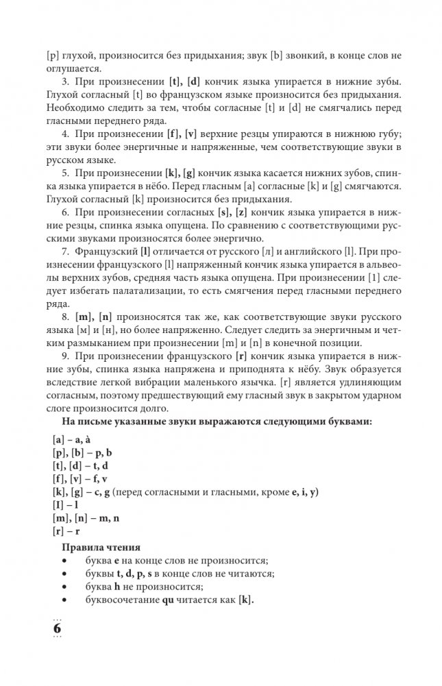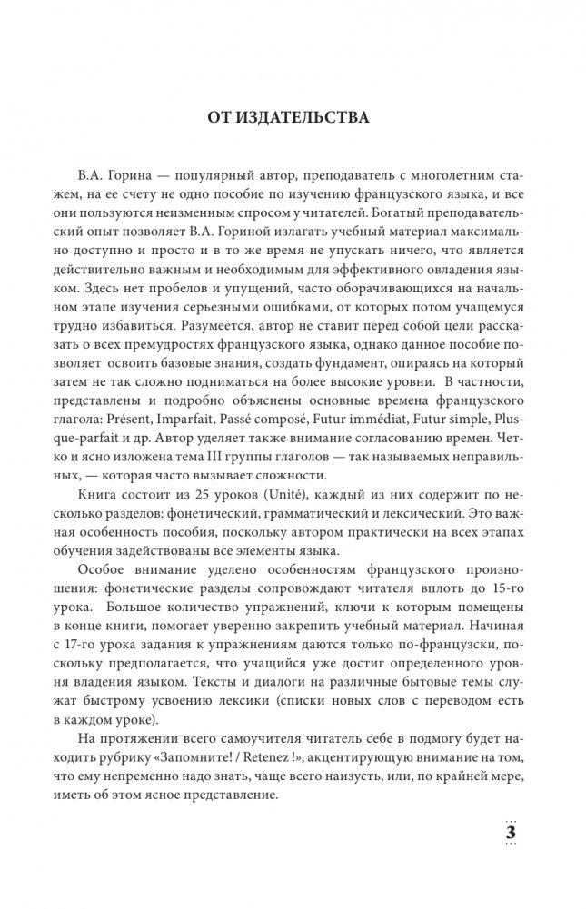 Книга состоит из 25 уроков и позволяет быстро и эффективно выучить язык, поднимаясь на всё более высокие уровни освоения. В пособии даны базовые сведения по грамматике, включая основные времена французских глаголов. Этого объема достаточно, чтобы начать уверенно читать по-французски и общаться на бытовые темы. Особое внимание уделено особенностям французского произношения: фонетические разделы сопровождают читателя вплоть до 15-го урока. Большое количество упражнений (ключи к ним помещены в конце книги) помогает уверенно закрепить учебный материал. А тексты и диалоги способствуют быстрому усвоению лексики (списки новых слов с переводом есть в каждом из уроков).