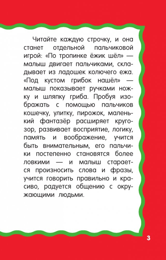 Любящие родители хотят, чтобы малыш рос здоровым, счастливым и умным, поэтому так важно разговаривать с ребёнком с первых дней жизни — кроха слышит мамин или папин голос, чувствует себя защищённым. Замечательная книжка-малышка "100 пальчиковых игр для запуска речи" поможет сделать мир ребёнка весёлым и интересным — малыш произнесёт свои первые слова, станет внимательным и любознательным, узнает много нового, освоит полезные навыки и научится общаться.