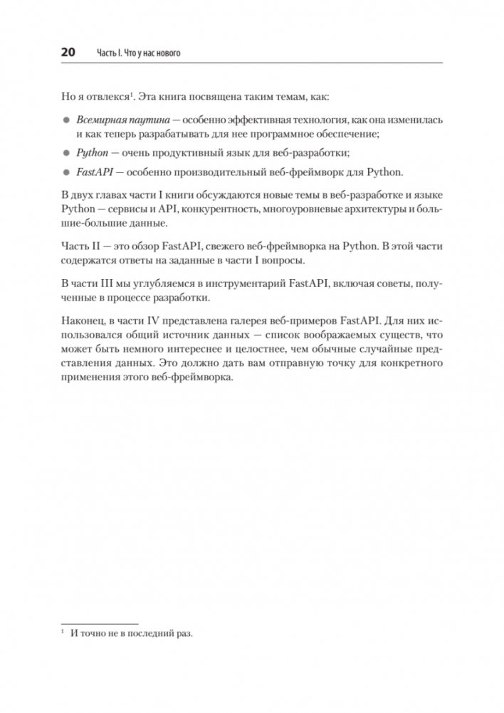FastAPI — относительно новый, но надежный фреймворк с чистым дизайном, использующий преимущества актуальных возможностей Python. Как следует из названия, FastAPI отличается высоким быстродействием и способен конкурировать в этом с аналогичными фреймворками на таких языках, как Golang. Эта практическая книга расскажет разработчикам, знакомым с Python, как FastAPI позволяет достичь большего за меньшее время и с меньшим количеством кода.