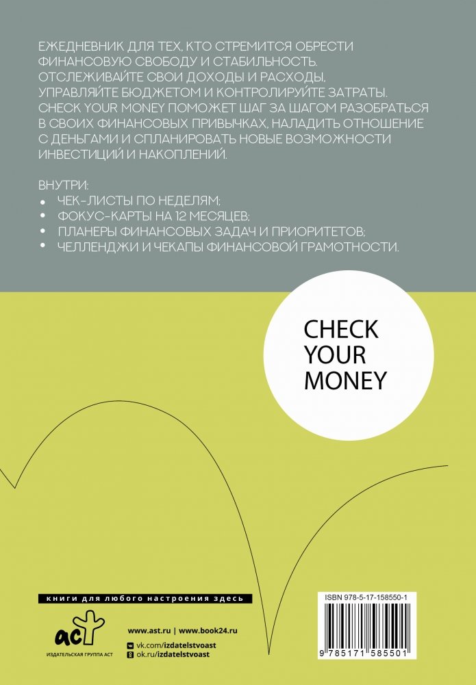 Ежедневник для тех, кто стремится обрести финансовую свободу и стабильность. Отслеживайте свои доходы и расходы, управляйте бюджетом и контролируйте затраты. Check your money поможет шаг за шагом разобраться в своих финансовых привычках, наладить отношение с деньгами, спланировать новые возможности инвестиций и накоплений.