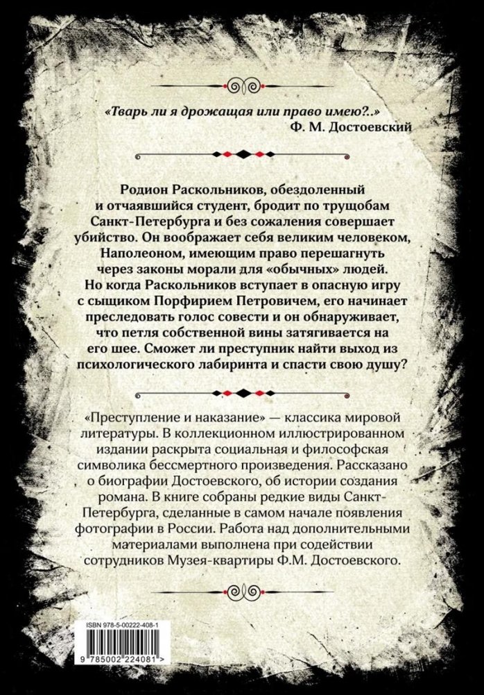"Преступление и наказание" — одно из самых значительных произведений в истории мировой литературы. Роман Федора Михайловича Достоевского ставит перед читателем важнейшие нравственно-мировоззренческие вопросы — о вере, совести, грехе и об искуплении через страдание. Задуманный как "психологический отчет одного преступления", роман Достоевского предстал перед читателем грандиозным художественно-философским исследованием человеческой природы, христианской трагедией о смерти и воскресении души. В новом коллекционном издании раскрыта религиозная, социальная и философская символика бессмертного произведения. Рассказано о биографии Федора Михайловича, об истории создания всемирного шедевра. Даны достоверные факты из сыскных дел дореволюционной России. Интереснейшие события созданного Достоевским философского полифонического романа здесь переплетены с реальной жизнью людей и перенесены на улицы красивейшего города планеты. В книге собраны редкие виды Санкт-Петербурга, сделанные в самом начале появления фотографии в России, во второй половине XIX века. Не менее интересны и документальные свидетельства того времени. Работа над дополнительными материалами выполнена при содействии сотрудников Музея-квартиры Ф.М. Достоевского.