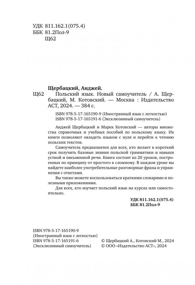 Анджей Щербацкий и Марек Котовский — авторы множества справочных и учебных пособий по польскому языку. Их книги позволяют овладеть языком с нуля и перейти к чтению польских текстов.