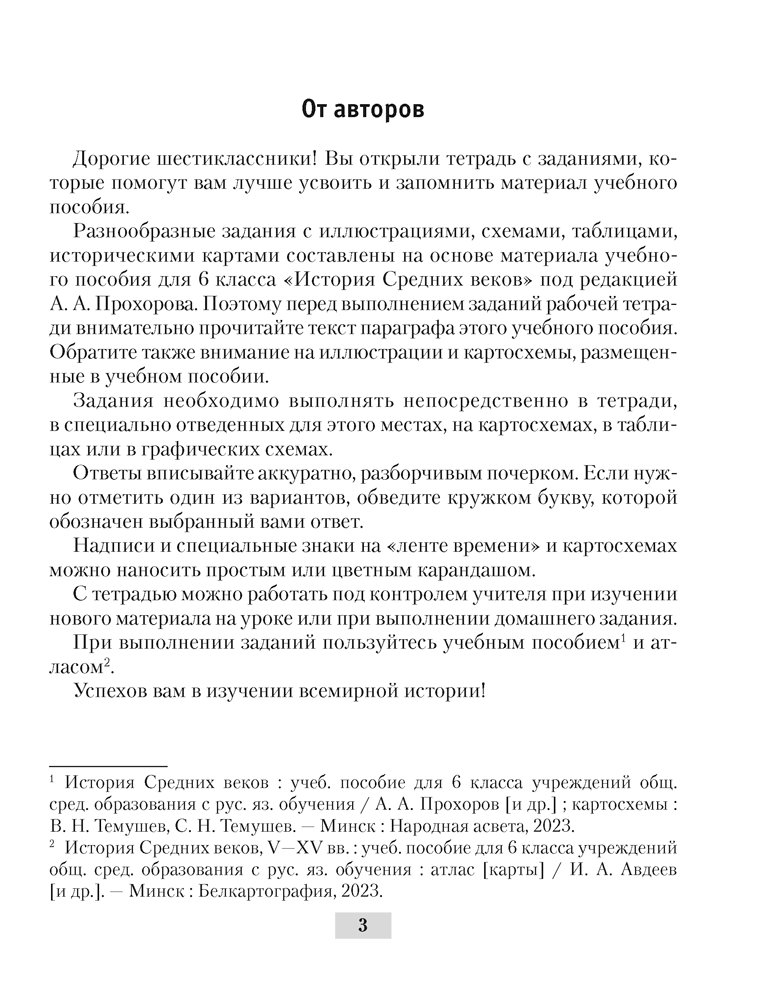 Рабочая тетрадь составлена в соответствии с программой и учебным пособием по истории Средних веков для 6 класса учреждений общего среднего образования. В ней содержатся задания разного уровня сложности, которые направлены на закрепление и проверку знаний, полученных учащимися на уроках всемирной истории, а также на формирование картографических и хронологических умений. Анализ документов, работа с иллюстративной и схематической наглядностью, заполнение таблиц и другие задания, размещенные в пособии, помогут в развитии мышления и формировании метапредметных компетенций.