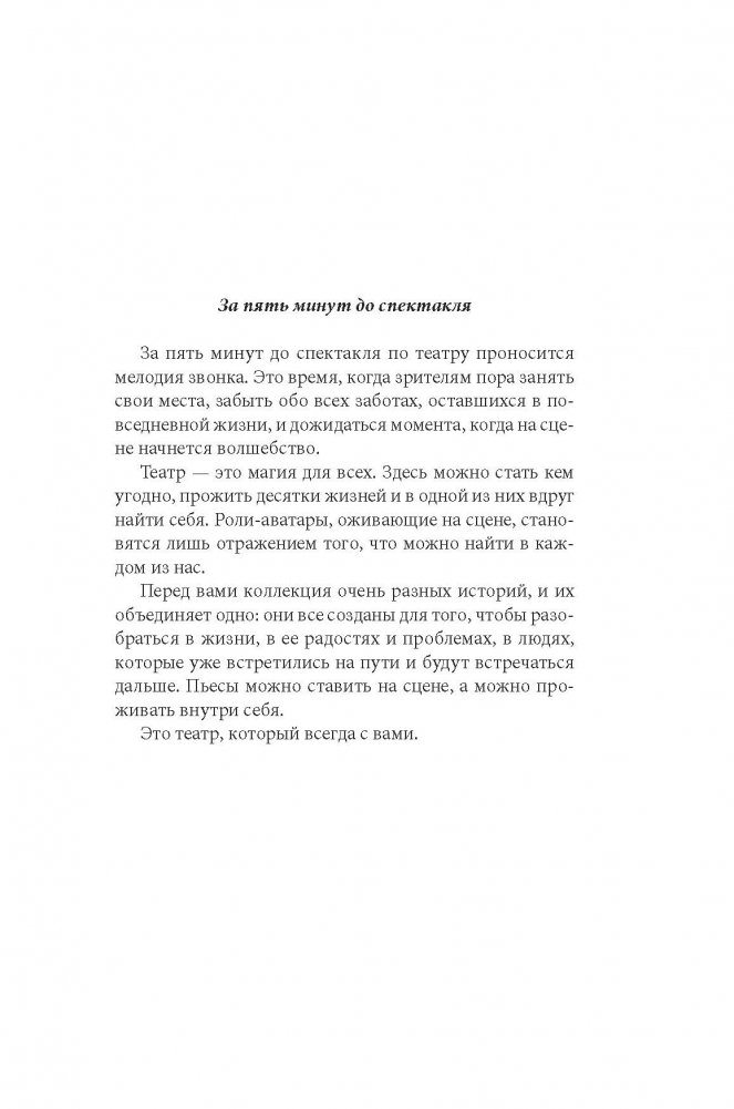 Театр - это портал, открывающий путь к разным историям и мирам. Как спастись, если на тебя начала охоту небесная лисица? Что делать, если на встречу вдруг пришли все аватары, созданные тобой в интернете? Как победить, если твоим главным соперником оказывается косточка авокадо - и неожиданно обходит тебя во всем? Можно ли справиться с тем самым злым и страшным серым волком, если родители поселили его прямо в твоем доме? Какую темную тайну потревожили блогеры в лесной хижине? Да и вообще, как разобраться в собственной жизни, если все говорят, что это легко, а это на самом деле порой так трудно? Ответы на эти и многие другие вопросы ждут на страницах сборника "Аватары театра"!