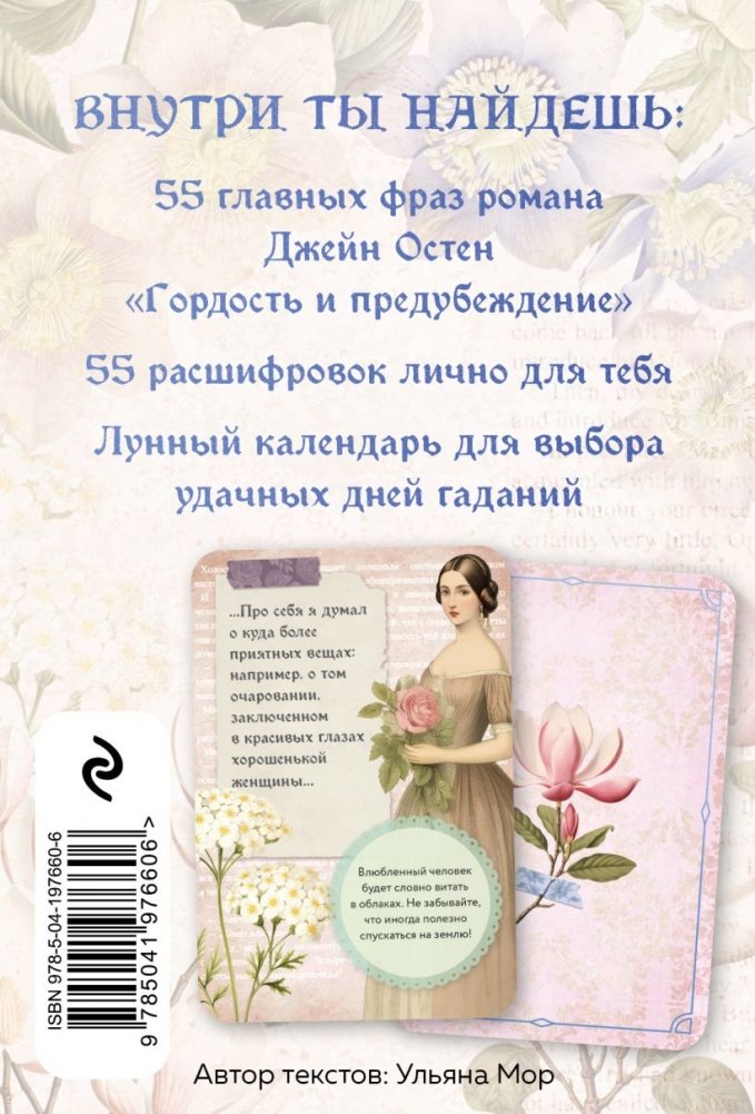 Гадайте на любовь! Оракул Джейн Остен составлен из главных фраз романа "Гордость и предубеждение" и трактовок к ним. Романтиченское предсказание и настроение на одной карте. В колоде 55 карт, инструкция и лунный календарь.