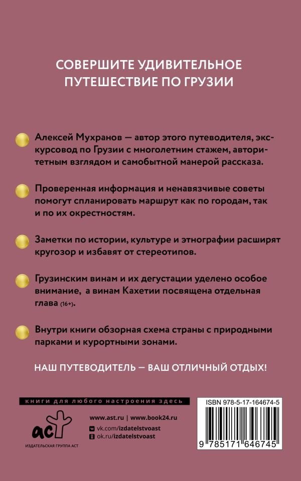 Путеводитель содержит информацию, которая поможет сориентироваться не только на местности, но и в грузинской действительности иного рода: в гастрономии, виноделии и среди людей. Внутри вы найдете указания на самые достойные кафе, обзор курортных мест и винодельческих хозяйств. Таким образом книга сэкономит изрядное количество времени и поможет получить наибольшее количество впечатлений наивысшего качества.