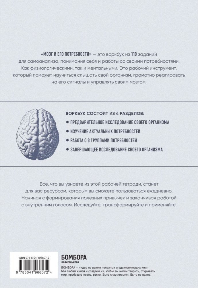 «Мозг и его потребности» содержит 110 заданий для самоанализа, понимания себя и работы со своими потребностями. Как физиологическими, так и ментальными. Это рабочий инструмент, который поможет научиться слышать свой организм, грамотно реагировать на его сигналы и управлять своим мозгом.
