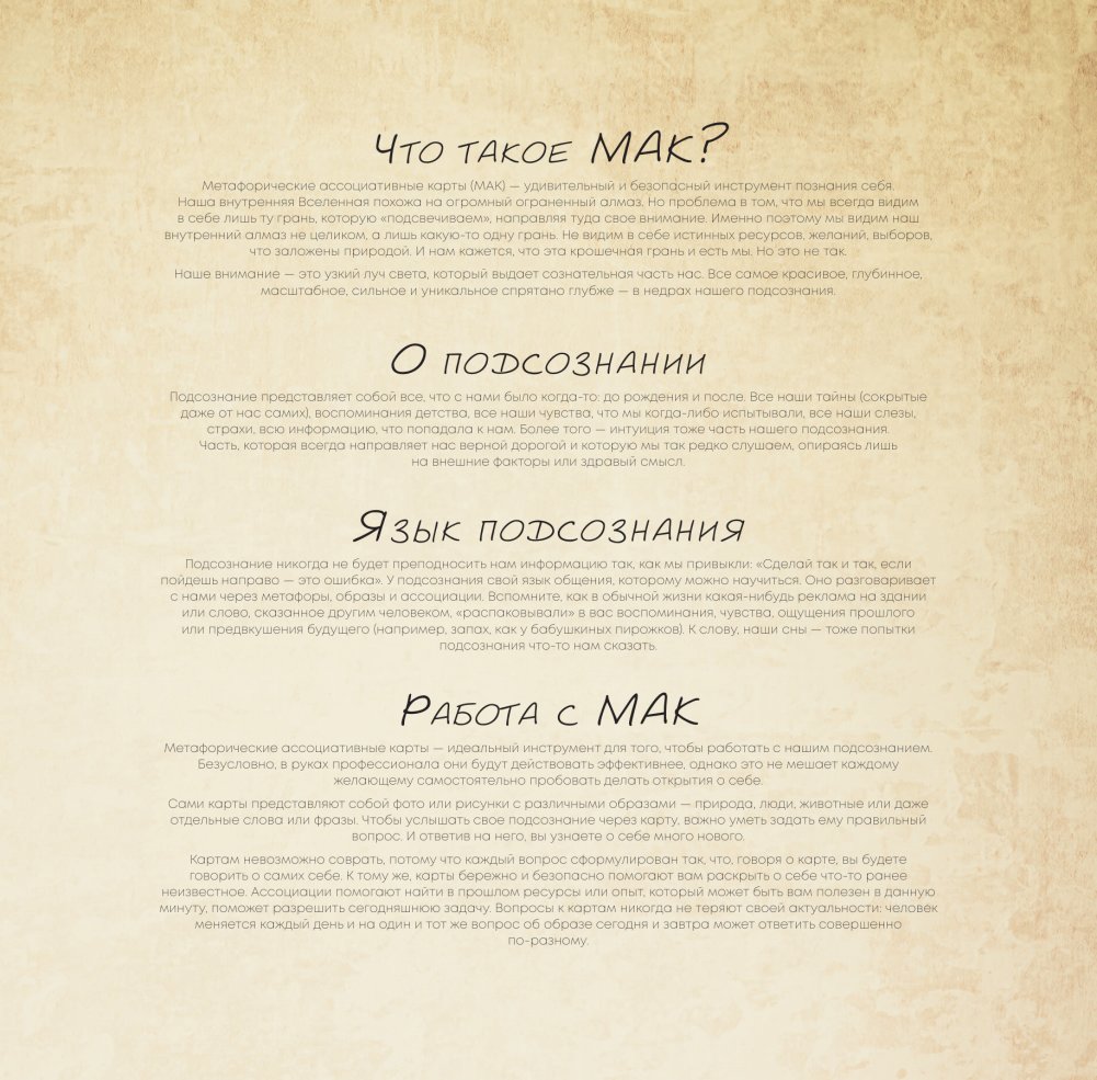 Волшебный календарь, наполненный символами и знаками для тех, кто любит получать подсказки из ярких образов и своего подсознания. В каждом месяце вы найдете необычную метафорическую иллюстрацию (карту) с текстом и вопросы на каждый день, которые помогут вам ежедневно находить новые послания во вселенной метафор. В календаре есть инструкция, которая расскажет о магии метафорических карт и о том, как с ними взаимодействовать.