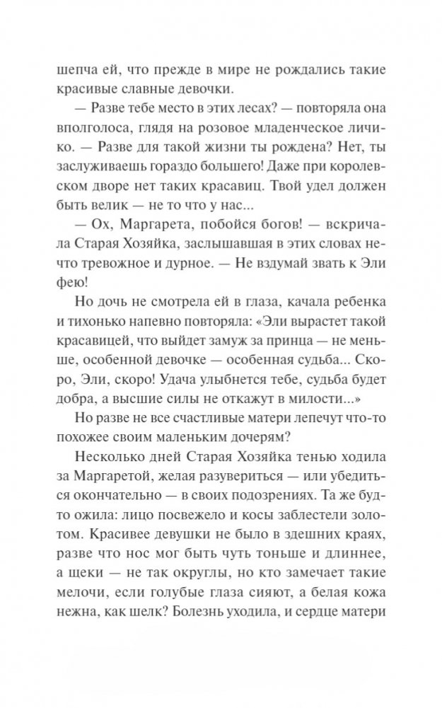 Так думает Маргарета и относит новорожденную Эли в тот самый сад, еще не зная, что милость крестной феи обернется настоящим проклятием. Решив уберечь дочь, родители растят ее в глуши, где днем с огнем не сыскать хотя бы рыцаря, не то что принца, — и жизнь течет своим чередом.