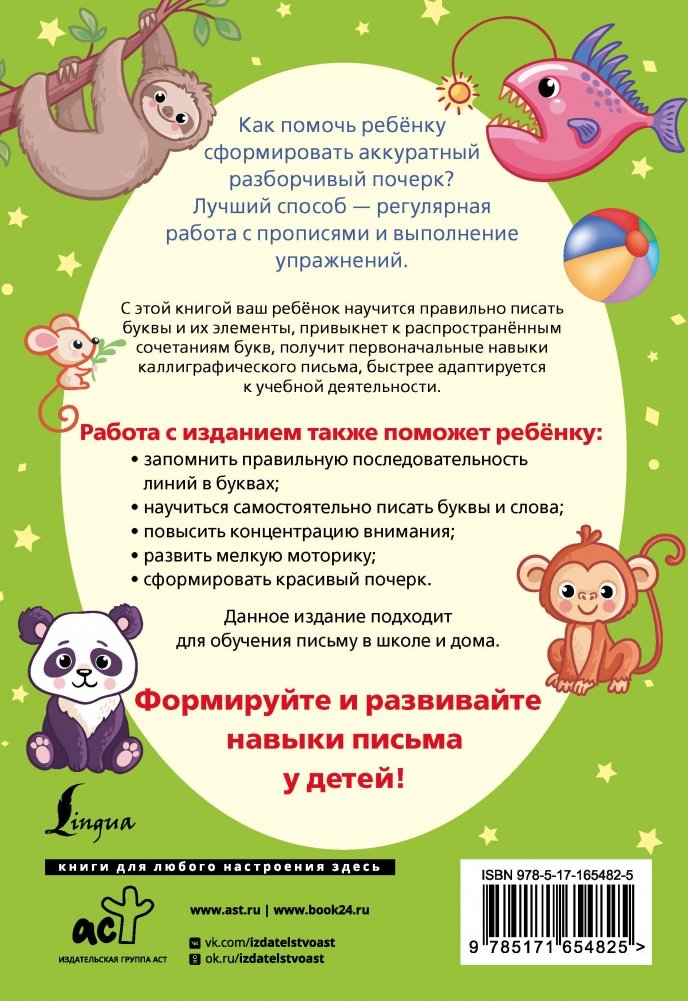 Издание включает палочки, крючки, плавные и кривые линии, буквы русского алфавита со стрелками, показывающими направление линий, а также сочетания букв, слова и предложения. Выполнение упражнений помогает формировать и отрабатывать навыки разборчивого, красивого, быстрого письма. Работа с прописями положительно влияет и на память, и на внимание младшего школьника, а также на его общее развитие. Прописи соответствуют требованиям ФГОС (Федерального государственного образовательного стандарта) и подходят к любым учебникам русского языка.