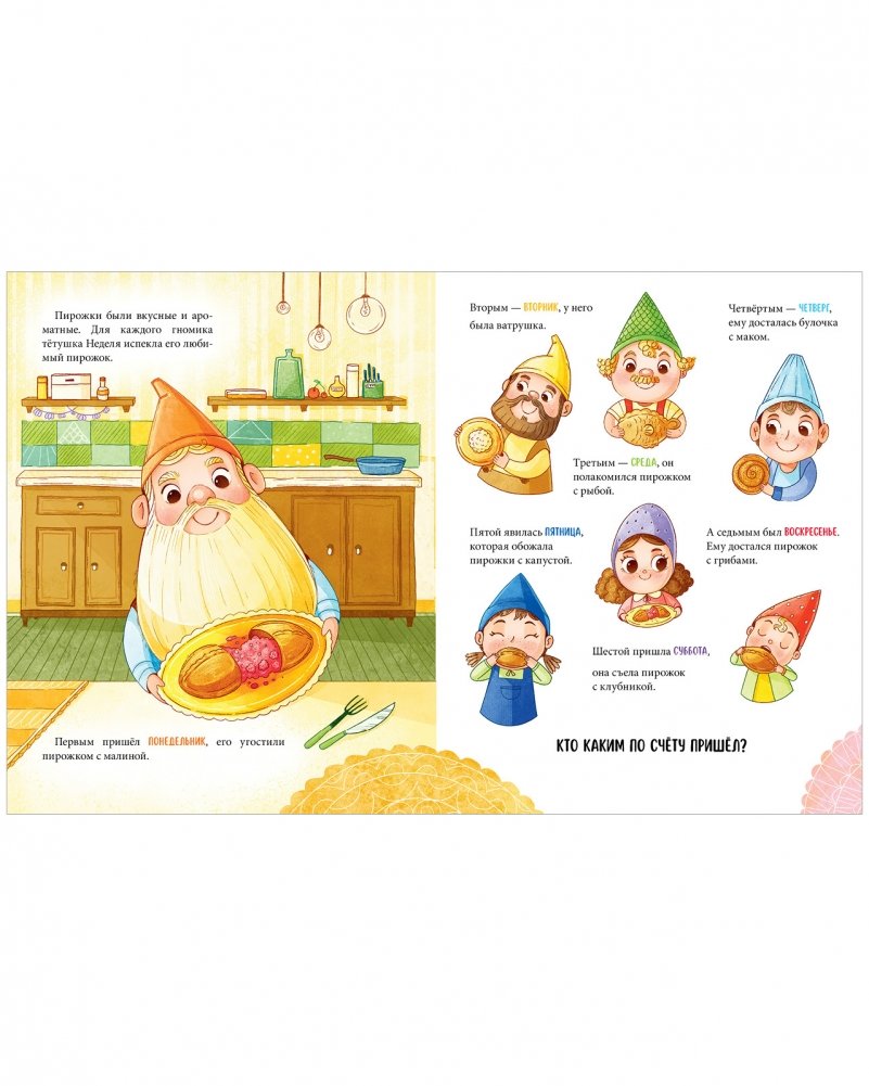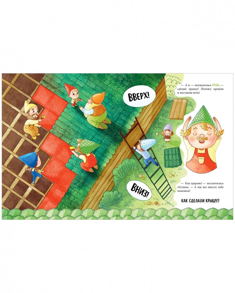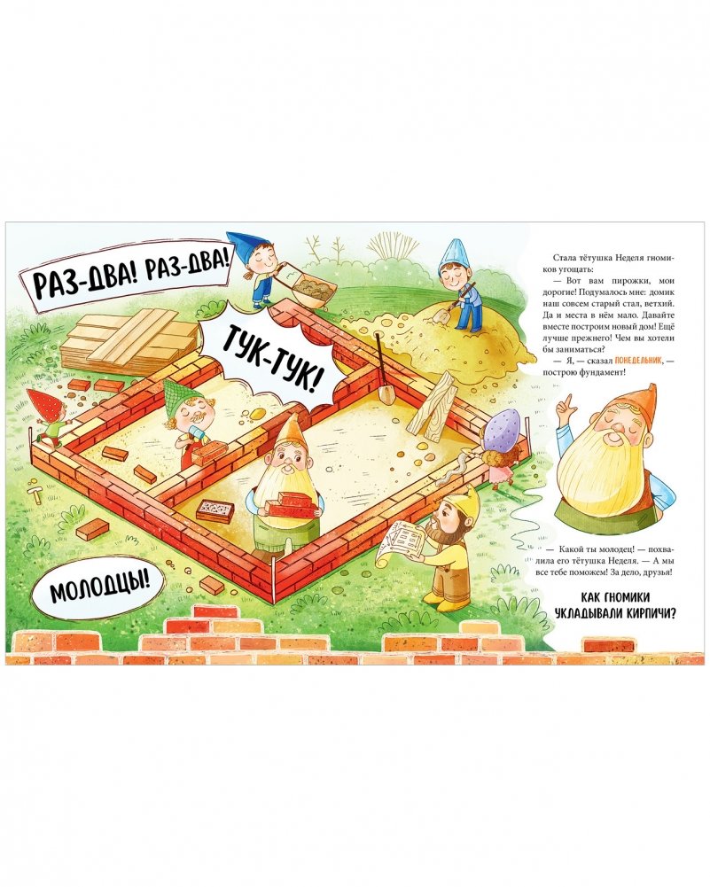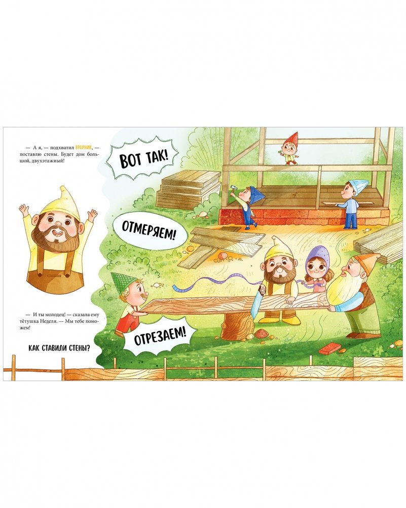 Юный читатель познакомится с симпатичной тетушкой Неделей и ее веселыми помощниками гномиками. Их зовут Понедельник, Вторник, Среда, Четверг, Пятница, Суббота и Воскресенье. У каждого гнома есть любимые шапочка и чашечка определенного цвета, а тетушка Неделя печет им излюбленные пирожки. Однажды гномики решили построить дом. Смогут ли они разделить обязанности и выполнить одно общее дело?