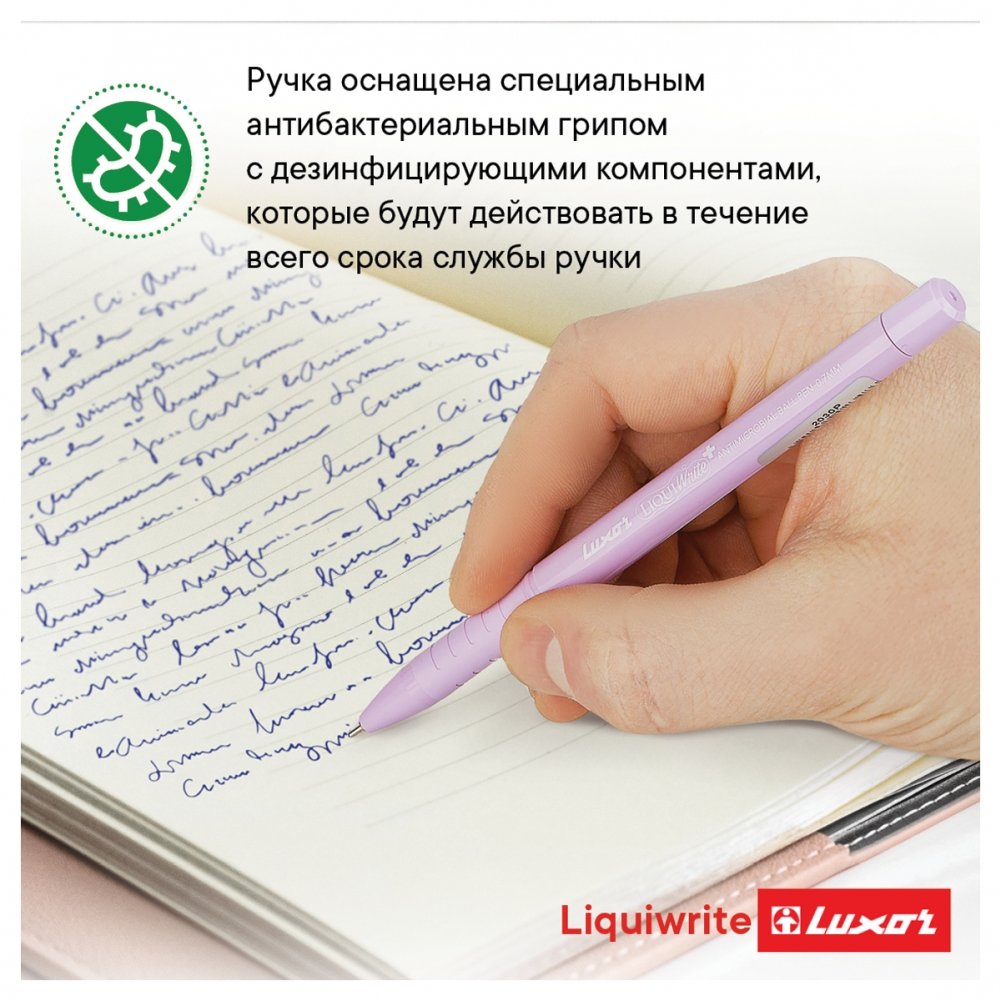 Шариковая ручка Luxor Liquiwrite – функциональный инструмент для ежедневного письма. Пишущий узел диаметром 0,7 мм оставляет линию толщиной 0,5 мм и подходит для любого стиля письма. Длина линии письма может достигать 1200 метров. Чернила на масляной основе благодаря пониженной вязкости обеспечивают мягкое ровное письмо и уверенное скольжение по бумаге. У ручки чернила синего цвета, поэтому она идеально подходит для учебы, работы, для ведения документооборота, заметок в ежедневнике, рисунков в скетчбуке. Диаметр корпуса – 15 мм. Ручка оснащена специальным антибактериальным грипом с дезинфицирующими компонентами, которые будут действовать в течение всего срока службы ручки. Мягкий резиновый грип снижает давление на пальцы рук при письме.