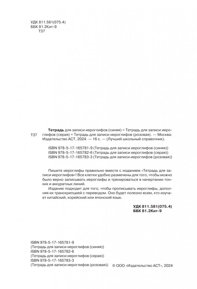 Издание подходит для того, чтобы прописывать иероглифы, дополняя их транскрипцией с переводом. Оно будет полезно всем, кто изучает китайский, корейский или японский язык.
