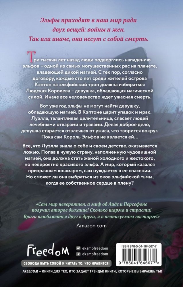 Все, что Луэлла знала о себе и своем детстве, оказывается ложью. Попав в чужую страну, наполненную чудовищной магией, она должна стать женой холодного и жестокого, но невероятно красивого эльфа. А мир, который казался призрачным кошмаром, сам нуждается в ее спасении. Но сможет ли она выбраться из оков эльфийской тьмы, когда ее собственное сердце в плену?