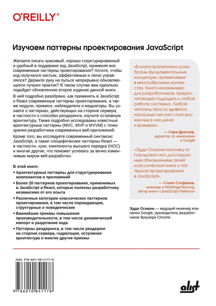 Основополагающая книга по паттернам архитектуры и проектирования приложений на языке JavaScript. Рассмотрены порождающие, поведенческие, структурные паттерны, модули, примеси, наблюдатели и медиаторы, применяемые в веб-разработке, архитектурные подходы MVC, MVP и MVVM, островная архитектура веб-приложений, серверные паттерны, в частности паттерны рендеринга, а также специфические темы и паттерны, важные при работе в React — де-факто главном фреймворке для клиентской веб-разработки на JavaScript.