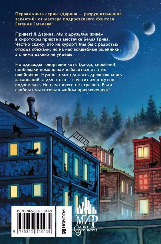 Первая книга серии «Дарина — разрушительница заклятий» от мастера подросткового фэнтези Евгения Гаглоева! Двенадцатилетняя Дарина с друзьями живет в сиротском приюте в местечке Белая Грива. Они бы с радостью оттуда сбежали, но на них волшебные ошейники, а с ними далеко не уйдешь. Но однажды говорящие коты пообещали помочь ребятам избавиться от этих ошейников. Нужно только достать древнюю книгу заклинаний, а для этого — спуститься в жуткое подземелье. Ради свободы отважные подростки готовы к любым приключениям!