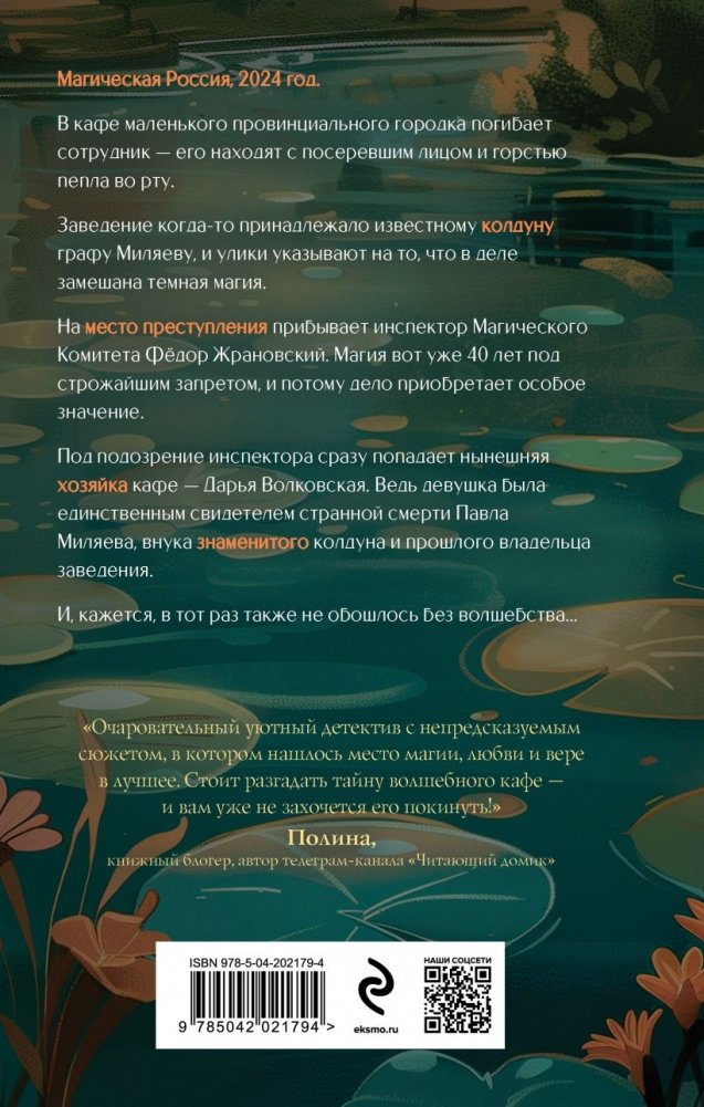 Магическая Россия, 2024 год. В кафе маленького провинциального городка погибает сотрудник — его находят с посеревшим лицом и горстью пепла во рту. Заведение когда-то принадлежало известному колдуну графу Миляеву, и улики указывают на то, что в деле замешана темная магия. На место преступления прибывает инспектор Магического Комитета Фёдор Жрановский. Магия вот уже 40 лет под строжайшим запретом, и потому дело приобретает особое значение. Под подозрение инспектора сразу попадает нынешняя хозяйка кафе — Дарья Волковская. Ведь девушка была единственным свидетелем странной смерти Павла Миляева, внука знаменитого колдуна и прошлого владельца заведения. И, кажется, в тот раз также не обошлось без волшебства…