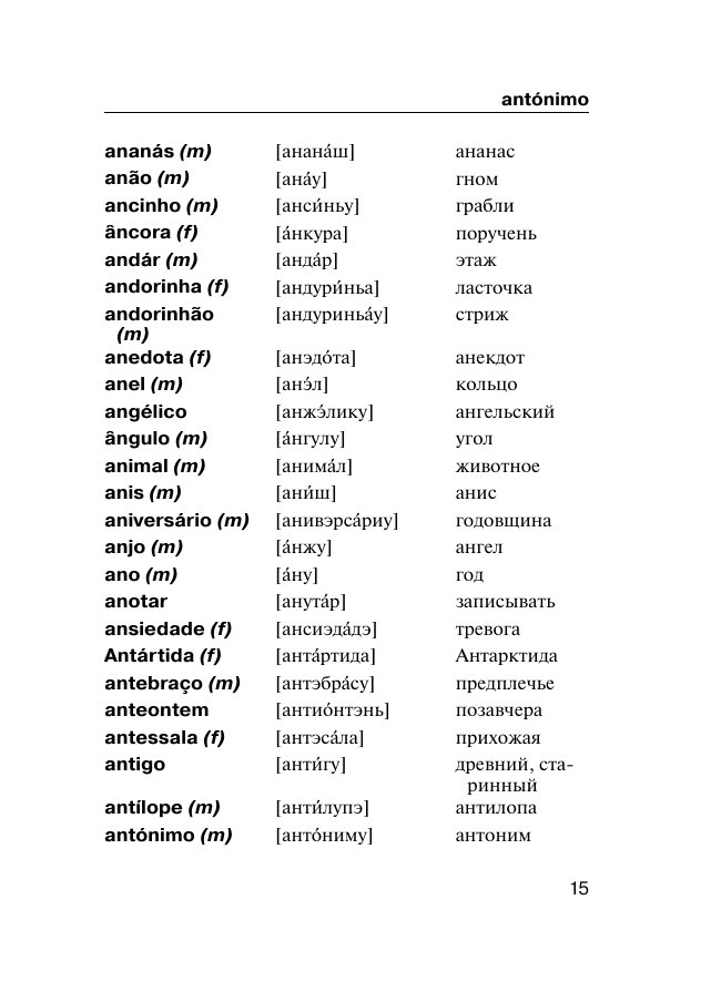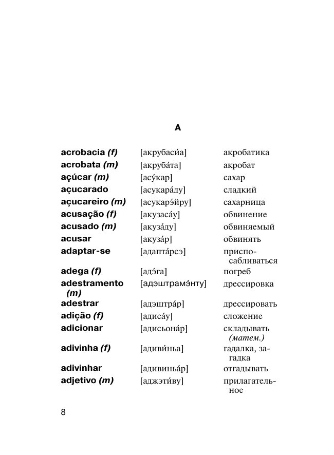 Португальско-русская и русско-португальская части словаря содержат примерно 4500 наиболее употребительных слов. Все слова снабжены транскрипцией, прописанной русскими буквами.