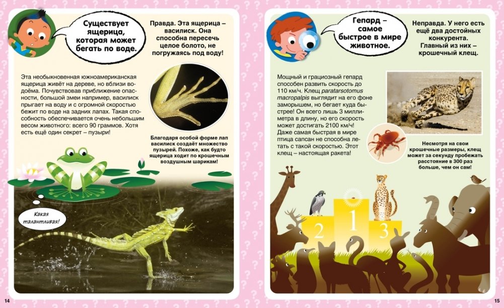 Правда ли, что страус от страха прячет голову в песок? Неужели у роботов действительно есть свой чемпионат мира по футболу? Правда, что некоторые ящерицы могут бегать по воде? Сколько вопросов задаёт любознательный ребёнок! С этой книгой он наконец-то раскроет все тайны и узнает много нового! В энциклопедии собраны поразительные факты о животных, природных явлениях, анатомии человека и даже истории разных стран! В конце книги даны тесты для закрепления полученных знаний.