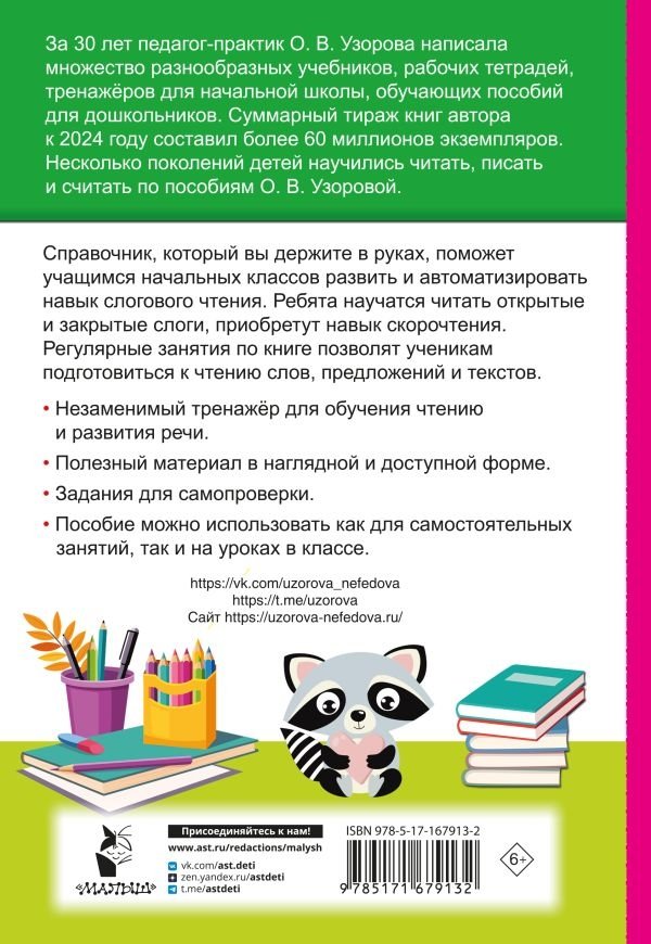 "Слоговые таблицы. Лёгкий способ научиться читать" — это пособие для учеников начальных классов, разработанное известным педагогом-практиком О. В. Узоровой. Благодаря занятиям по книге школьник научится читать слоги из одной, двух и трёх букв, разовьёт речевые навыки, увеличит скорость чтения. Пособие содержит слоговые таблицы и задания на время, которые помогут оценить успехи ребёнка.
