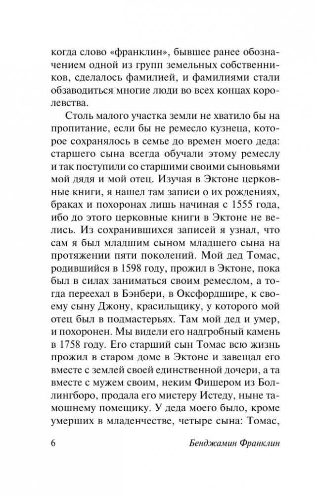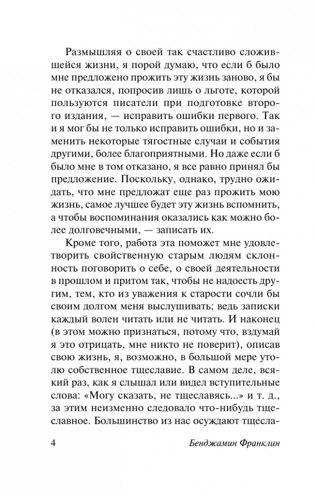 Автобиография Бенджамина Франклина — одна из самых увлекательных историй жизни человека, который всего добился сам, пройдя путь от недоучки до знаменитого политического деятеля, бизнесмена и ученого. События его судьбы доказывают, что для человека с пытливым умом и кипучей энергией любые проблемы становятся возможностями, а препятствия на пути к успеху только формируют характер и закаляют волю.