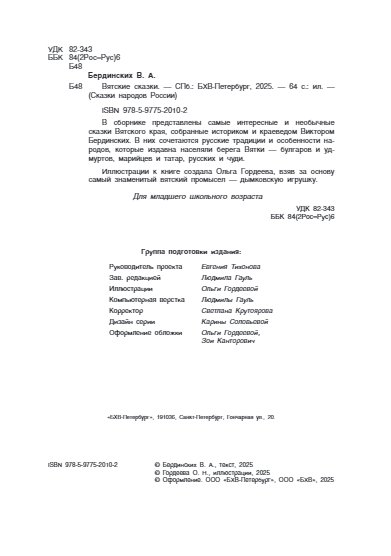 В сборнике представлены самые интересные и необычные сказки вятского края, собранные историком и краеведом Виктором Бердинских. В них сочетаются русские традиции и особенности народов, которые издавна населяли берега Вятки — булгаров и удмуртов, марийцев и татар, русских и чуди.