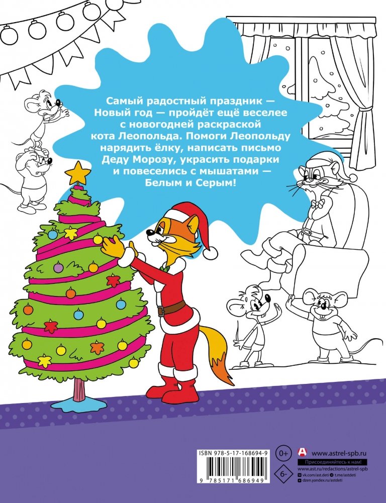 Самый радостный праздник — Новый год — пройдёт ещё веселее с новогодней раскраской кота Леопольда. Помоги Леопольду нарядить ёлку, написать письмо Деду Морозу, украсить подарки и повеселись с мышатами — Белым и Серым! Используй яркие цвета, фантазию и не забудь про хорошее настроение!