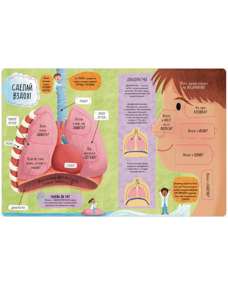 Книга дает простые толкования сложным понятиям, текст специально адаптирован для восприятия ребенка, а красочные иллюстрации помогают наглядно представить устройство человеческого организма, удерживать внимание и интерес. На каждом развороте — несколько вопросов, ответы на которые прячутся под окошками.