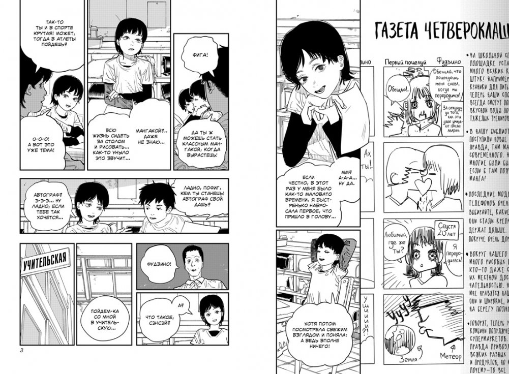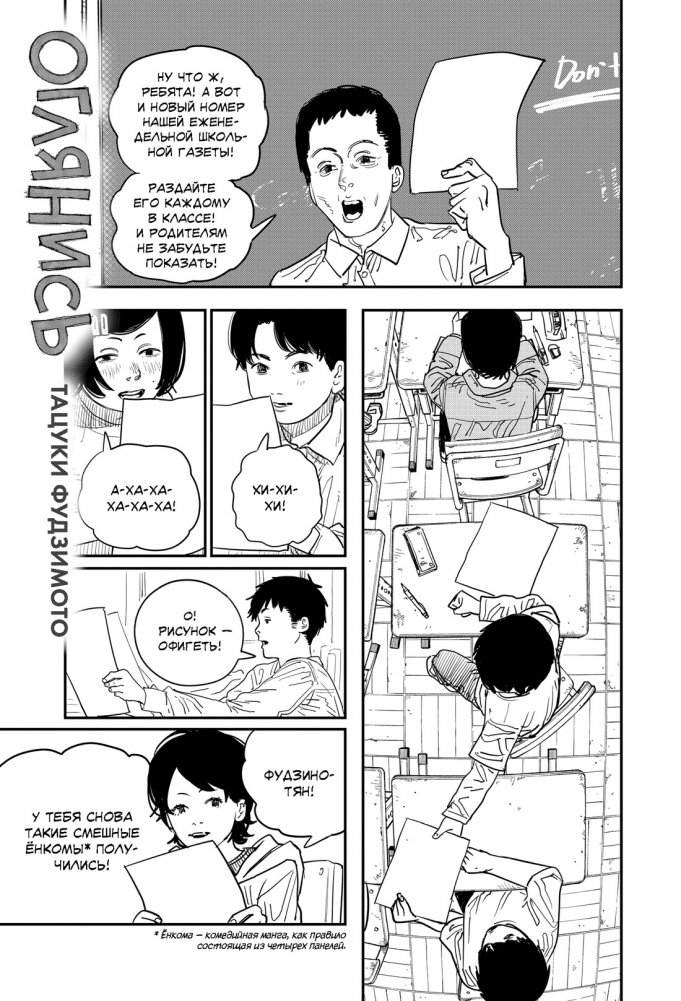 Путь мангаки тернист и непрост... Но именно на этот путь решают ступить две школьницы Фудзино и Кёмото. После внезапной и судьбоносной встречи девочки решают объединить усилия и подать свою работу в известный журнал манги. Впереди художниц ждут успех, признание и годы совместного творчества. Но выдержит ли их дружба испытания, которые готовит девочкам мир рисованных историй?.. «Оглянись» — одно из последних произведений Тацуки Фудзимото, автора таких популярных серий, как «Человек-бензопила» и «Огненный удар». Это пронзительная и невероятно лиричная история о мечтах, утратах и неудержимом стремлении к совершенству, в которой Фудзимото честно рассказывает о том, что ждет отважных мечтателей, решивших посвятить свою жизнь созданию манги.