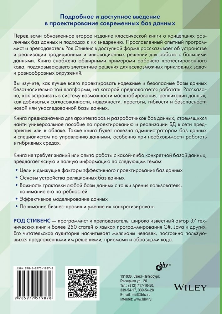 Книга о проектировании и поддержке широкого спектра реляционных и нереляционных баз данных на любой аппаратной платформе и в кроссплатформенных окружениях. Описано, как развёртывать и использовать базы данных на корпоративных серверах и в облаке. Изложены базовые принципы масштабирования, репликации, обеспечения согласованности данных, надёжности и безопасности облачных, корпоративных и гибридных решений. Для прочтения книги не требуются знания конкретных баз данных, книга может применяться как для проектирования базы данных с нуля, так и для доработки унаследованного продукта.