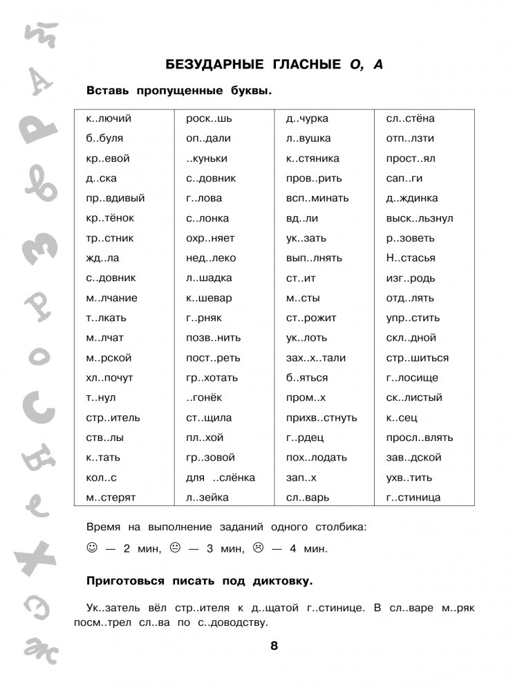 В пособие вошли задания на все орфограммы и правила, которые помогут ребёнку научиться писать грамотно и обеспечат более глубокое усвоение материала. Ребёнок будет не только вставлять пропущенную букву или знак, но и найдёт ошибки в словах, выполнит задания на время, объяснит орфограммы в диктанте, повторит правила и словарные слова, выполнит тесты.
