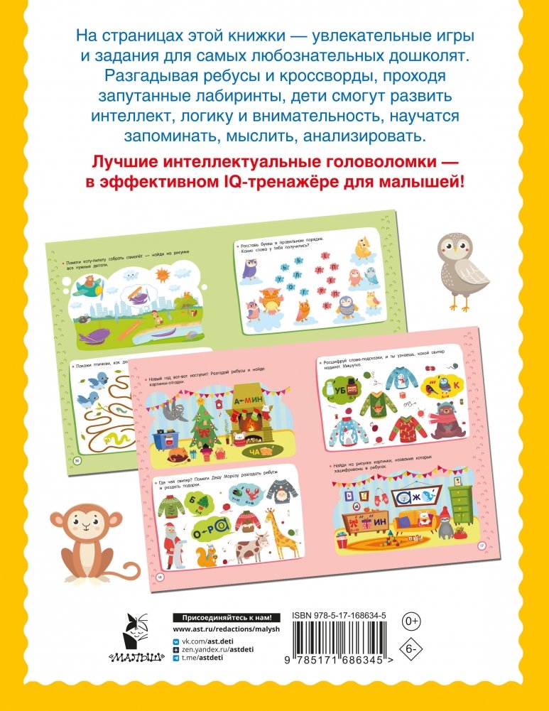 "500 увлекательных IQ-заданий для дошколят. 5-7 лет" — это большой сборник увлекательных заданий: ребусов, кроссвордов, игр с буквами и словами, задачек на логику и сообразительность. Интересные головоломки на любой вкус помогут ребёнку развить интеллект и внимание, зрительное восприятие и мелкую моторику, пополнить словарный запас, проявить творческие способности.