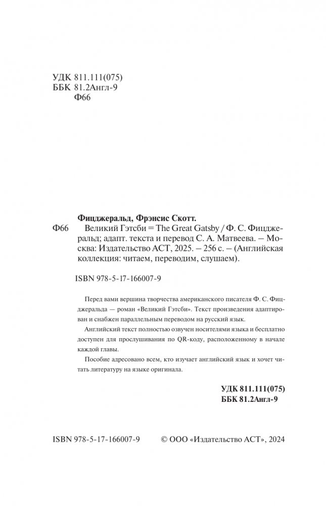 Перед вами вершина творчества американского писателя Ф.С. Фицджеральда — роман "Великий Гэтсби". Текст произведения адаптирован и снабжен параллельным переводом на русский язык.