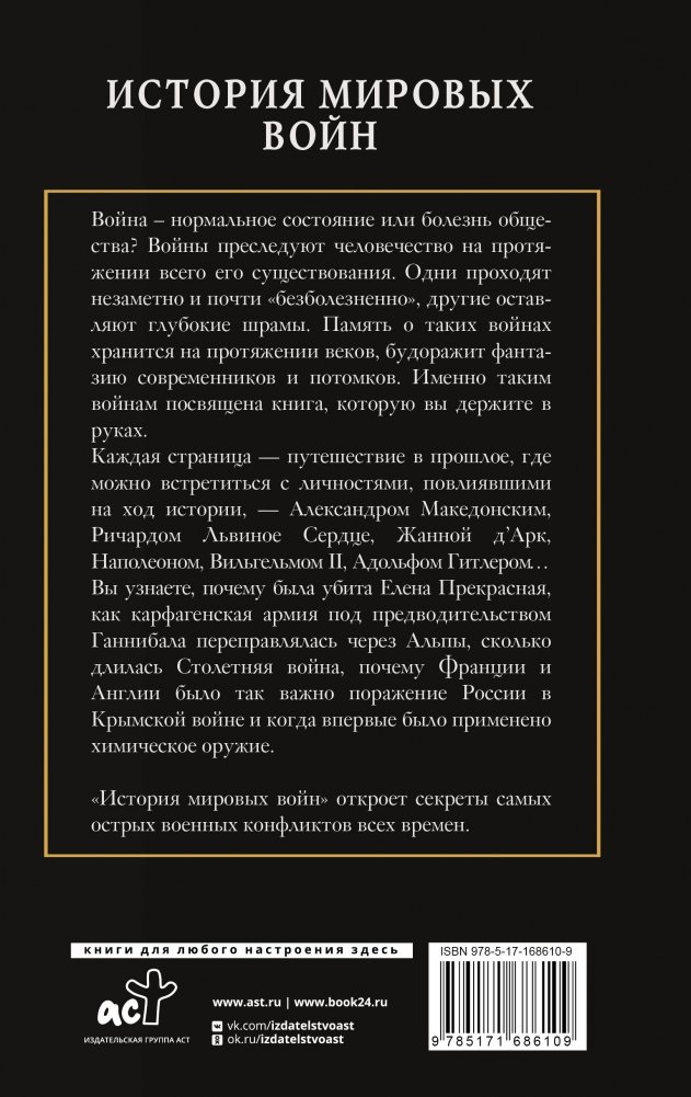 Каждая страница – путешествие в прошлое, где можно встретиться с личностями, повлиявшими на ход истории, - Александром Македонским, Ричардом Львиное Сердце, Жанной Д’Арк, Наполеоном, Вильгельмом II, Адольфом Гитлером… Вы узнаете, почему была убита Елена Прекрасная, как карфагенская армия под предводительством Ганнибала переправлялась через Альпы, сколько длилась Столетняя война, почему Франции и Англии было так важно поражение России в Крымской войне и когда впервые было применено химическое оружие.