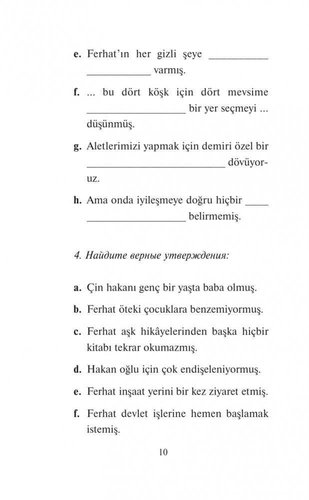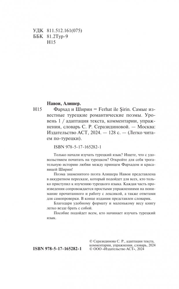 Поэма знаменитого поэта Алишера Навои представлена в аккуратном пересказе, который подойдет для всех, кто только приступил к изучению турецкого языка. Каждая часть произведения сопровождается простыми упражнениями на понимание прочитанного и работу с лексикой, а также ответами для самопроверки. В конце издания представлен словарик.