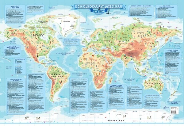 Физическая карта мира, дополненная полезной и интересной информацией о рельефе, климате и природных рекордах на нашей планете, будет полезна школьникам на уроках и при выполнении домашних заданий. Яркие наклейки помогут ребятам лучше усвоить новые знания.